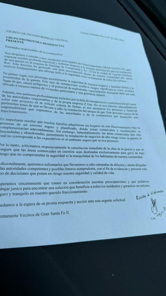 Ante lo anterior, se organizaron rápidamente entre todos los vecinos, incluidos los de fraccionamientos cercanos como Santiago de Compostela, Gran Canaria, 127, 123, Iberia, Miraflores, para reunir firmas, elaborar escritos y hacerlos llegar a las dependencias correspondientes para exigirles que se frenara la construcción de esta gasera, un riesgo latente para ellos.