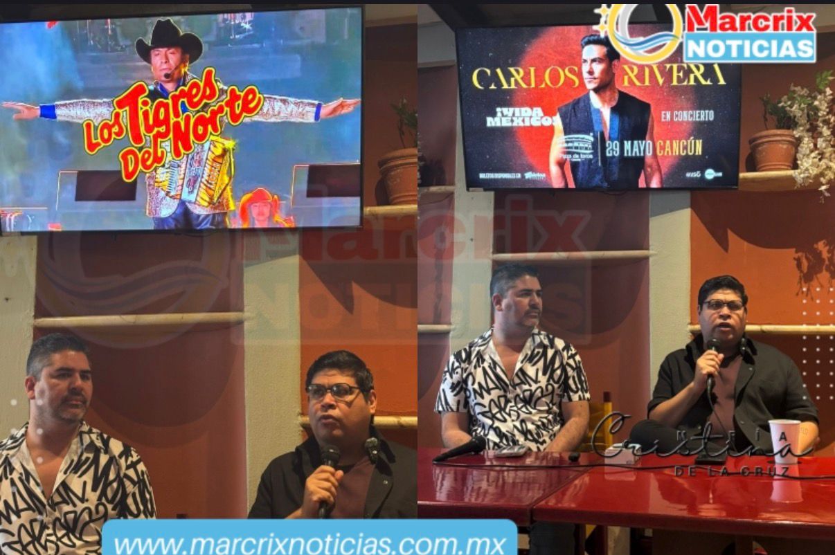 Durante el encuentro con medios, representantes de la empresa, fundada en Torreón, Coahuila, informaron que Los Tigres del Norte se presentarán el 27 de febrero de 2026 en el Estadio Olímpico Andrés Quintana Roo, mientras que Carlos Rivera llegará a Cancún el 29 de mayo en la Plaza de Toros Cancún, dos recintos que esperan recibir a miles de asistentes.