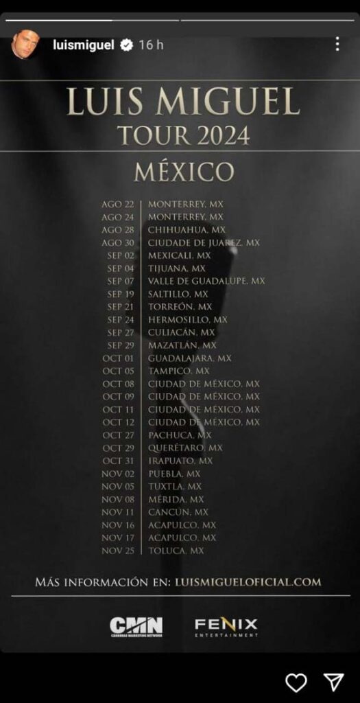 De acuerdo a la “historia” de Luis Miguel, en 2024 habrá una gira por 23 ciudades de la República Mexicana. Estas son las fechas que se mencionan en la publicación: