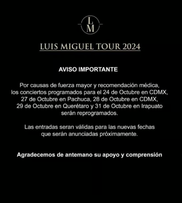 Ciudad de México (Marcrix, Noticias).- Luis Miguel volvió a reprogramar varias fechas de su gira en México, dejando a sus fans en un estado de incertidumbre. A través de un comunicado en las redes sociales de la Arena CDMX, se anunció la suspensión del concierto programado para este jueves 24 de octubre, así como cuatro fechas adicionales en otras ciudades.
