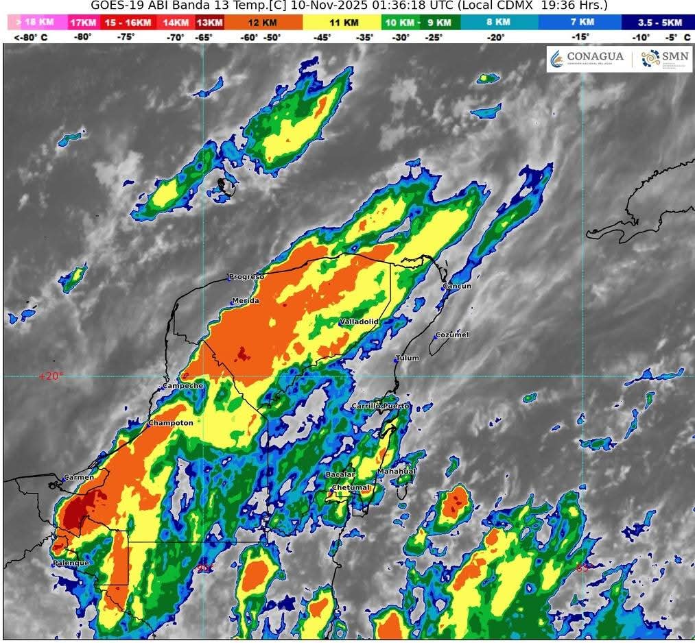 En la Península de Yucatán, el cielo se mantendrá de medio nublado a nublado, con lluvias fuertes en el suroeste de Campeche y chubascos en Yucatán, lo que podría generar inundaciones locales y encharcamientos.