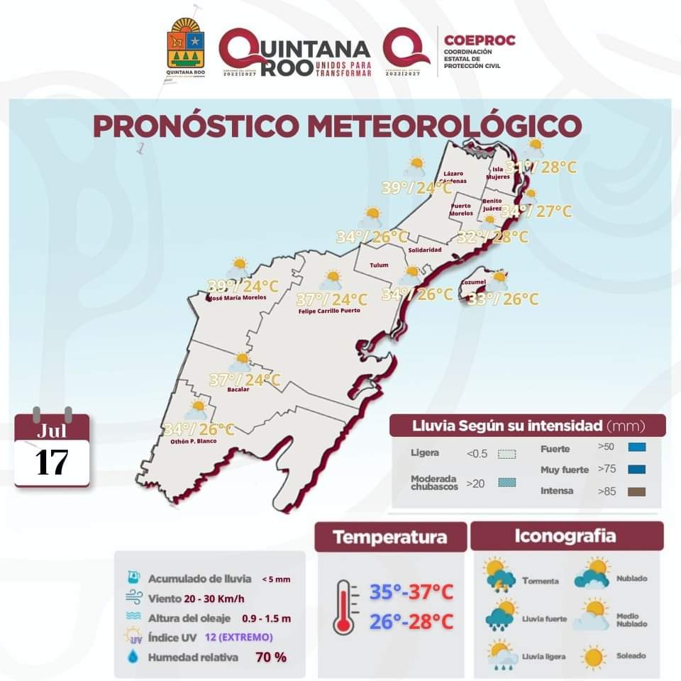7.- JOSÉ MARÍA MORELOS.- parcialmente nublado, lluvias aisladas y chubascos acompañados de actividad eléctrica, muy caluroso, viento del este y noreste 15 a 25 km/h con rachas más fuertes.