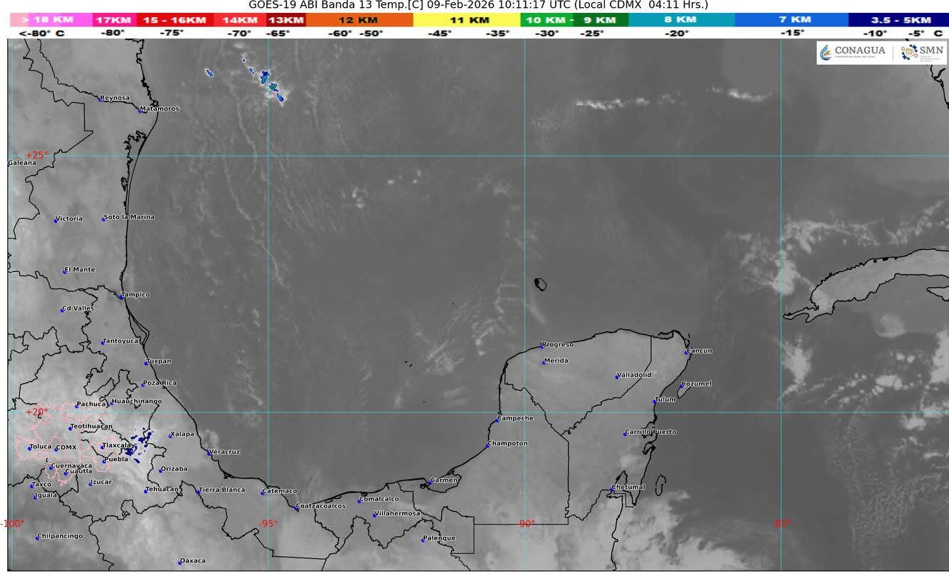 Cancún(Marcrix Noticias).- Se mantiene un sistema de alta presión localizado sobre el Noreste del Golfo de México impulsa vientos del Noreste y Este, originará cielo parcialmente nublado con incremento de nublados durante el transcurso del día, lluvias aisladas (acumulados menoras a 5 mm), ambiente cálido a caluroso durante el día y fresco a frío por la madrugada y al amanecer, viento con rachas de 40 km/h. Se prevé bancos de niebla en tramos carretero, zonas rurales y urbanas del estado.