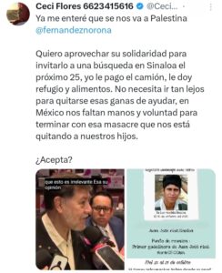 “Ya me enteré que se nos va a Palestina. Quiero aprovechar su solidaridad para invitarlo a una búsqueda en Sinaloa el próximo 25; yo le pago el camión, le doy refugio y alimentos. No necesita ir tan lejos para demostrar su apoyo: en México nos faltan manos y voluntad para terminar con esta masacre que nos está arrebatando a nuestros hijos”, expresó Flores a través de redes sociales.
