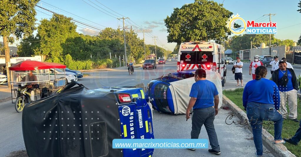 El impacto provocó la volcadura de las dos unidades, el mototaxi 596 que circulaba sobre la Av. Centenario, y el otro vehículo con número económico 210, que iba sobre la avenida Costa Maya.
