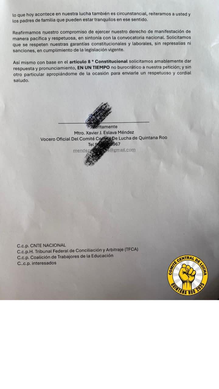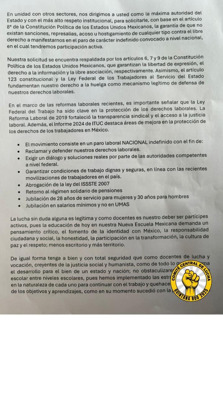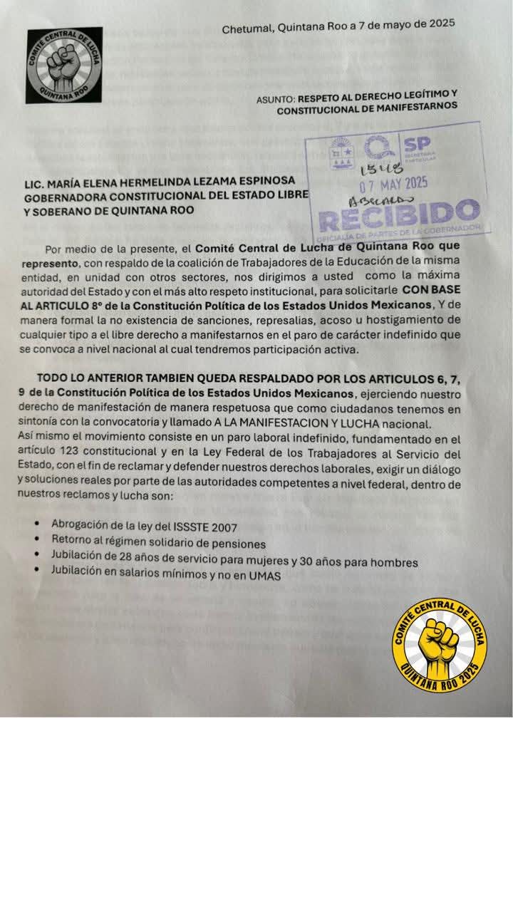 El Comité Central de Lucha que encabeza Xavier Méndez ha convocado a los maestros a protestar y unirse al paro nacional los días 14, 15 y 16 de mayo en Carrillo Puerto y los que no puedan asistir, se queden en sus escuelas pero de “brazos caídos” es decir, sin trabajar con los alumnos.