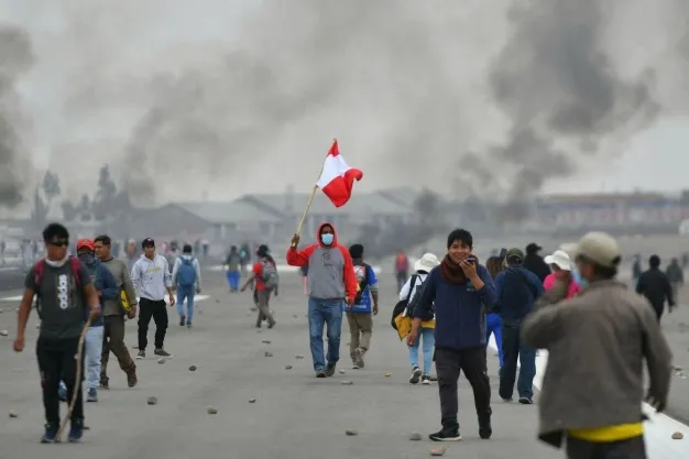 Con piedras, palos quemados y neumáticos en llamas cientos de manifestantes bloquean la pista de aterrizaje del aeropuerto de Arequipa, segunda ciudad de Perú, para pedir la renuncia de la presidenta Dina Boluarte, pese a su anuncio de que intentará adelantar elecciones para abril de 2024.