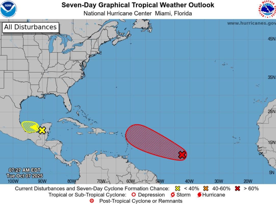 Actualmente, una zona de baja presión ubicada a unos 4,910 kilómetros al este de Cancún presenta un 90% de probabilidad de desarrollo ciclónico en las próximas 48 horas y mantiene el mismo nivel de riesgo a siete días.