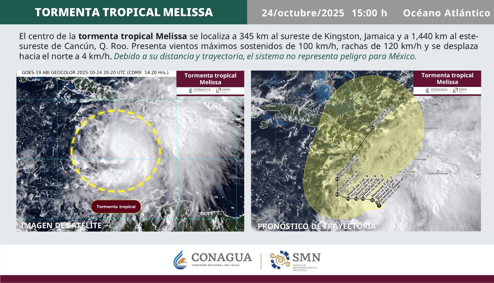 Chetumal (Marcrix Noticias).- El centro de la tormenta tropical Melissa se localiza a 345 km al sureste de Kingston, Jamaica y a mil 440 km al este sureste de Cancún, Quintana Roo y no representa peligro alguno para las costas mexicanas.