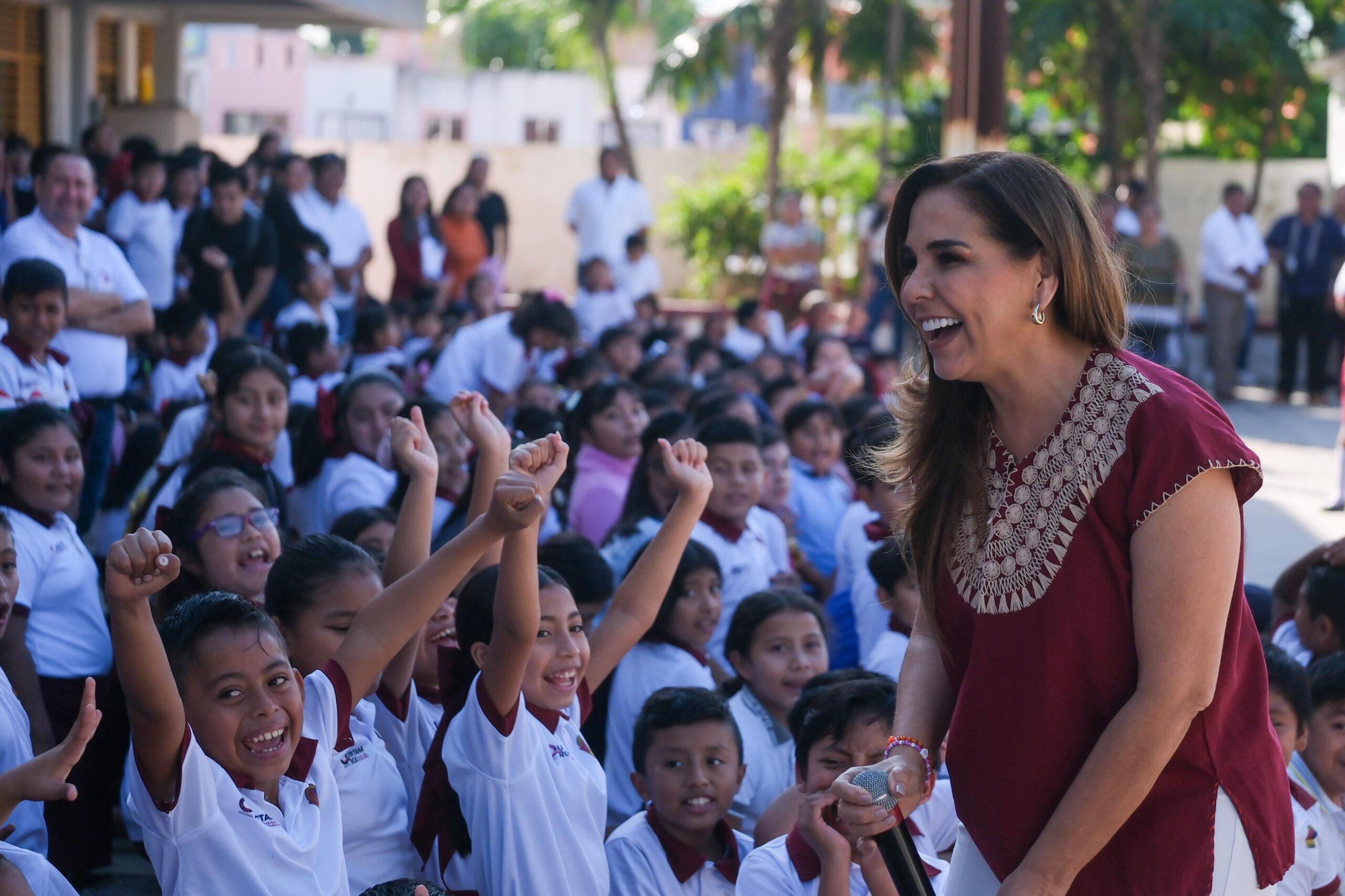 Alumnas y alumnos recibieron a Mara Lezama con mucha alegría, le entregaron regalitos como moñitos, pulseras, cartitas. Junto la presidenta Ana Paty Peralta escuchó a cada uno de los y las estudiantes. La alumna América Hernández Rodríguez, del 5º A, le pidió la construcción del domo, para dejar de padecer los efectos del sol y la lluvia cuando realizan sus actividades fuera del aula.