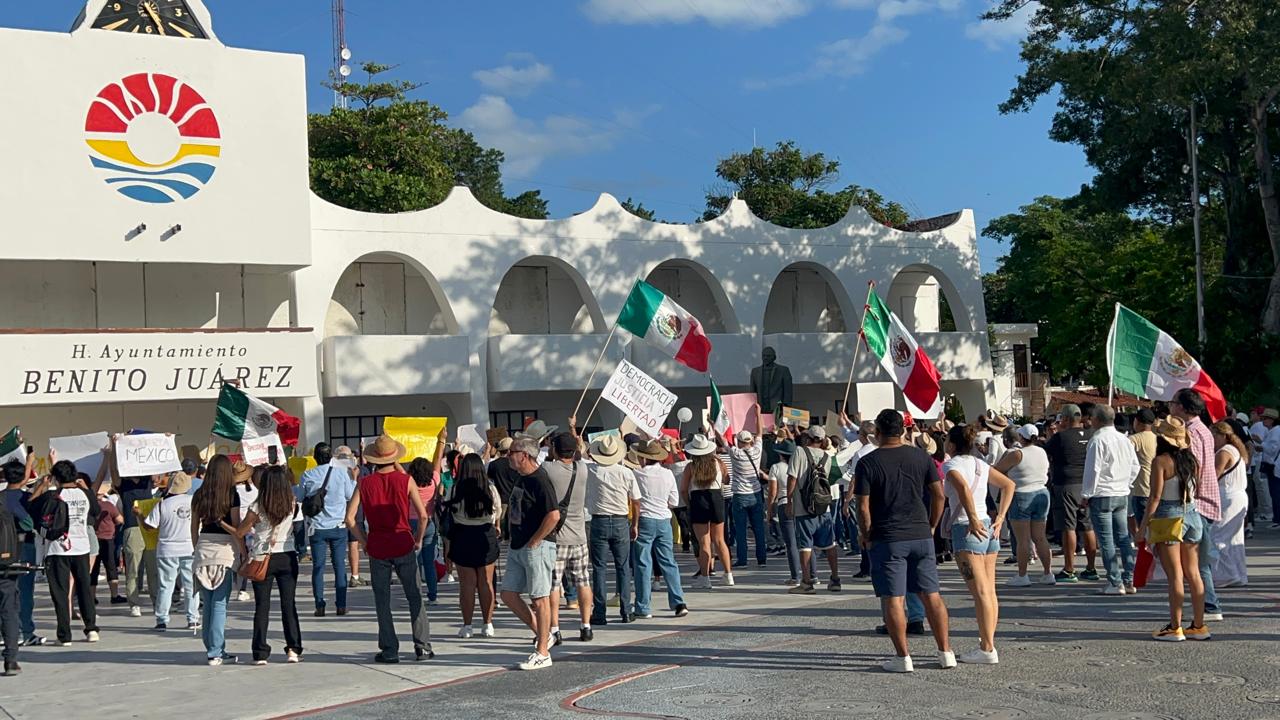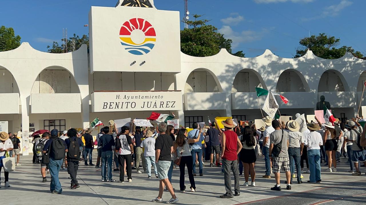 Los manifestantes se concentraron a las 16:00 horas frente a Plaza Las Tiendas, ubicada sobre la avenida José López Portillo esquina con Tulum, desde donde partieron rumbo al Palacio Municipal.