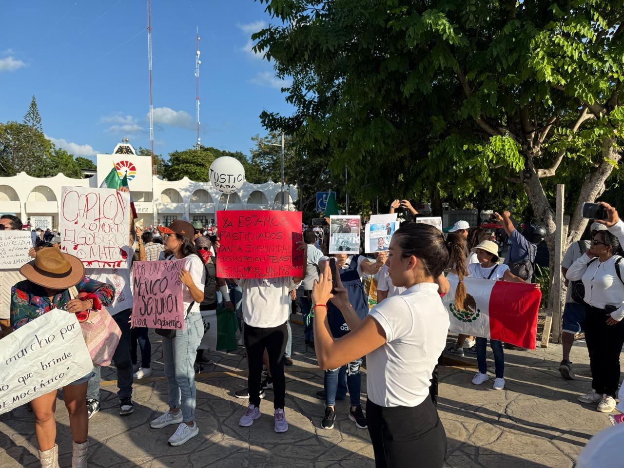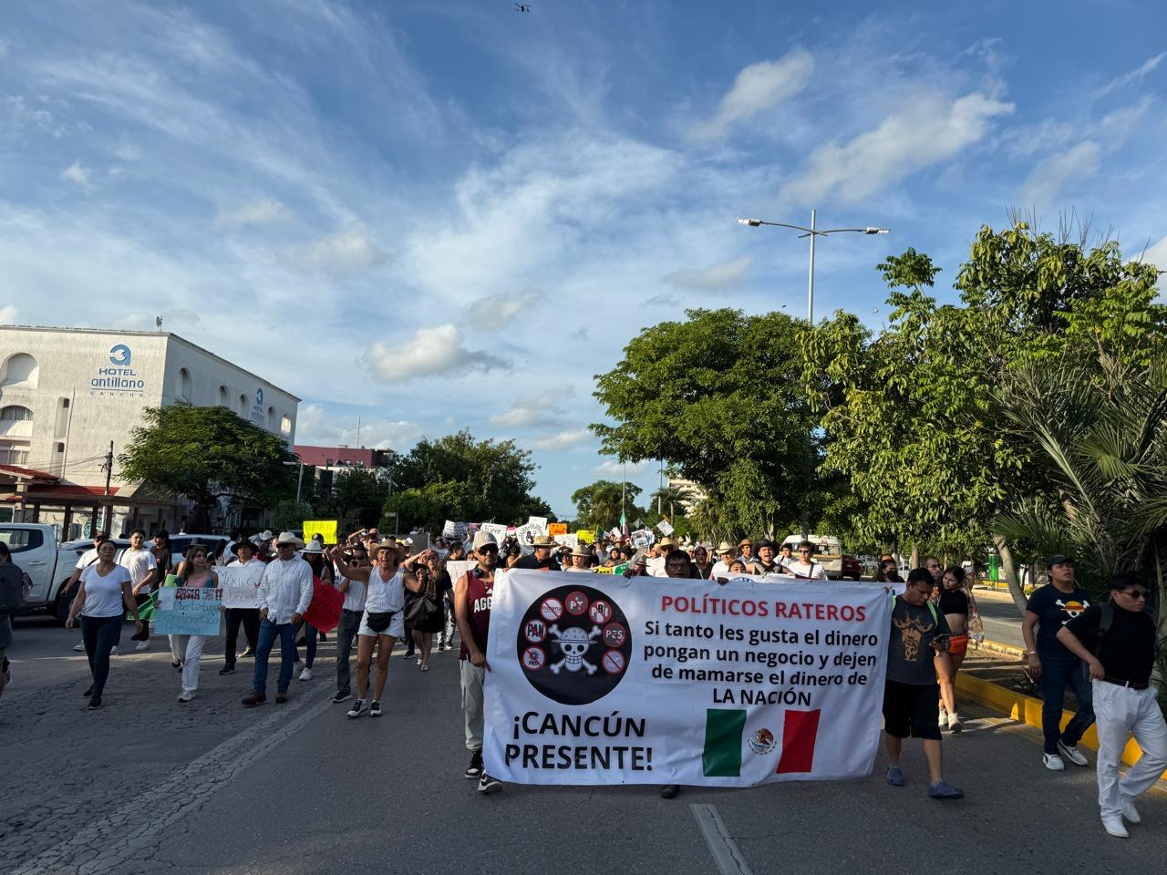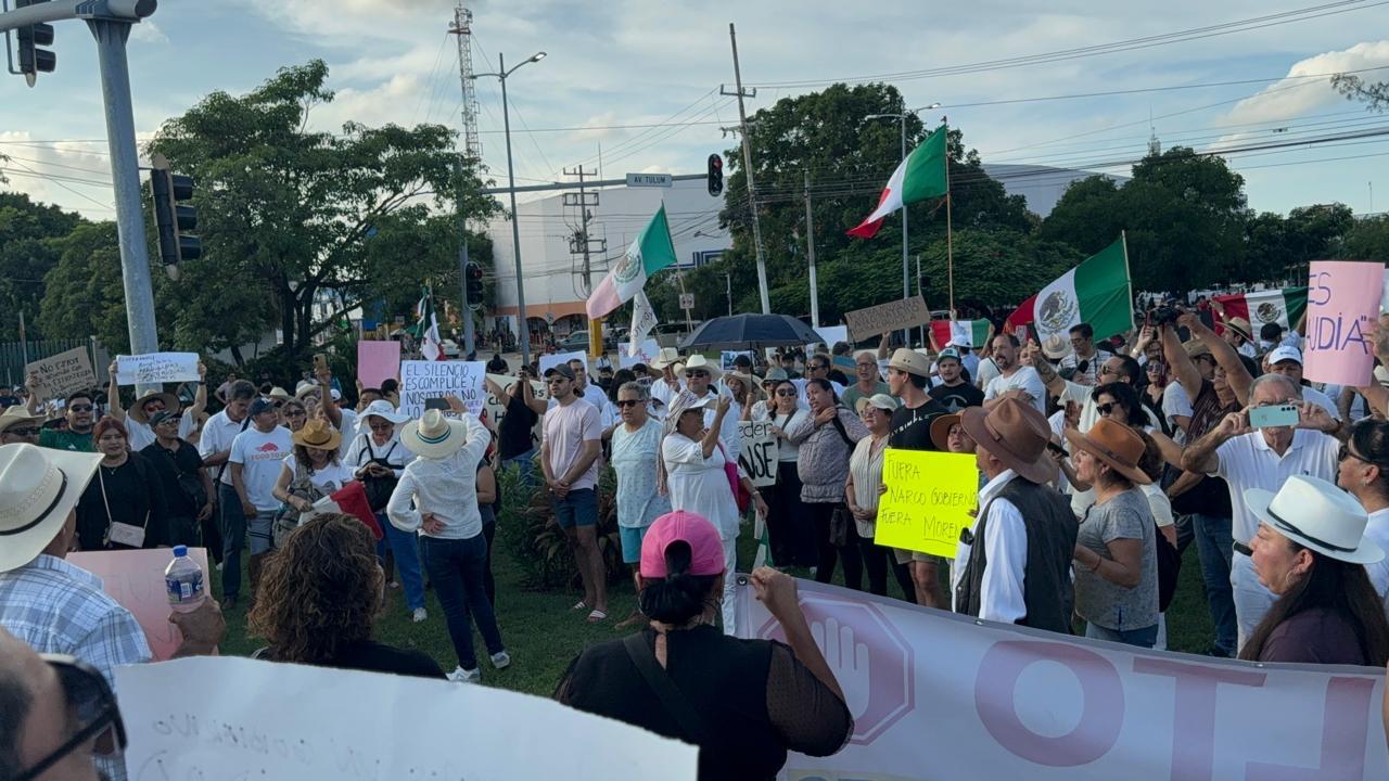 La manifestación se convocó tras el asesinato del alcalde de Uruapan, Carlos Manzo y otro grupo avanzó por la avenida Cobá hasta llegar minutos después de las 4.30 pm a la Glorieta del Ceviche y de ahí por la avenida Tulum hacia la Plaza Reforma en el Palacio Municipal.