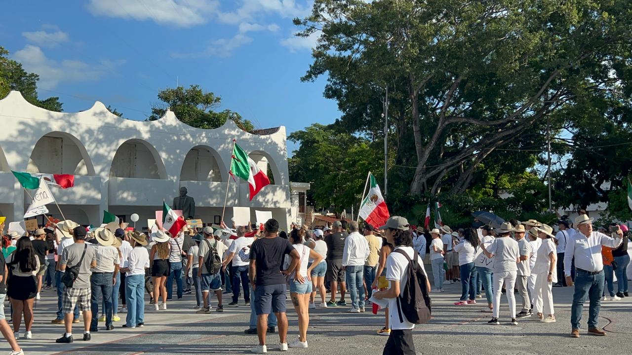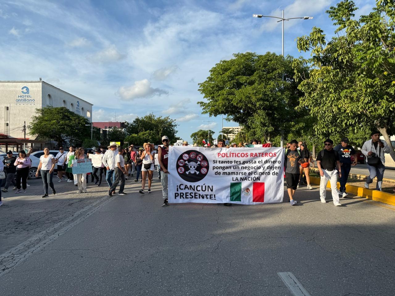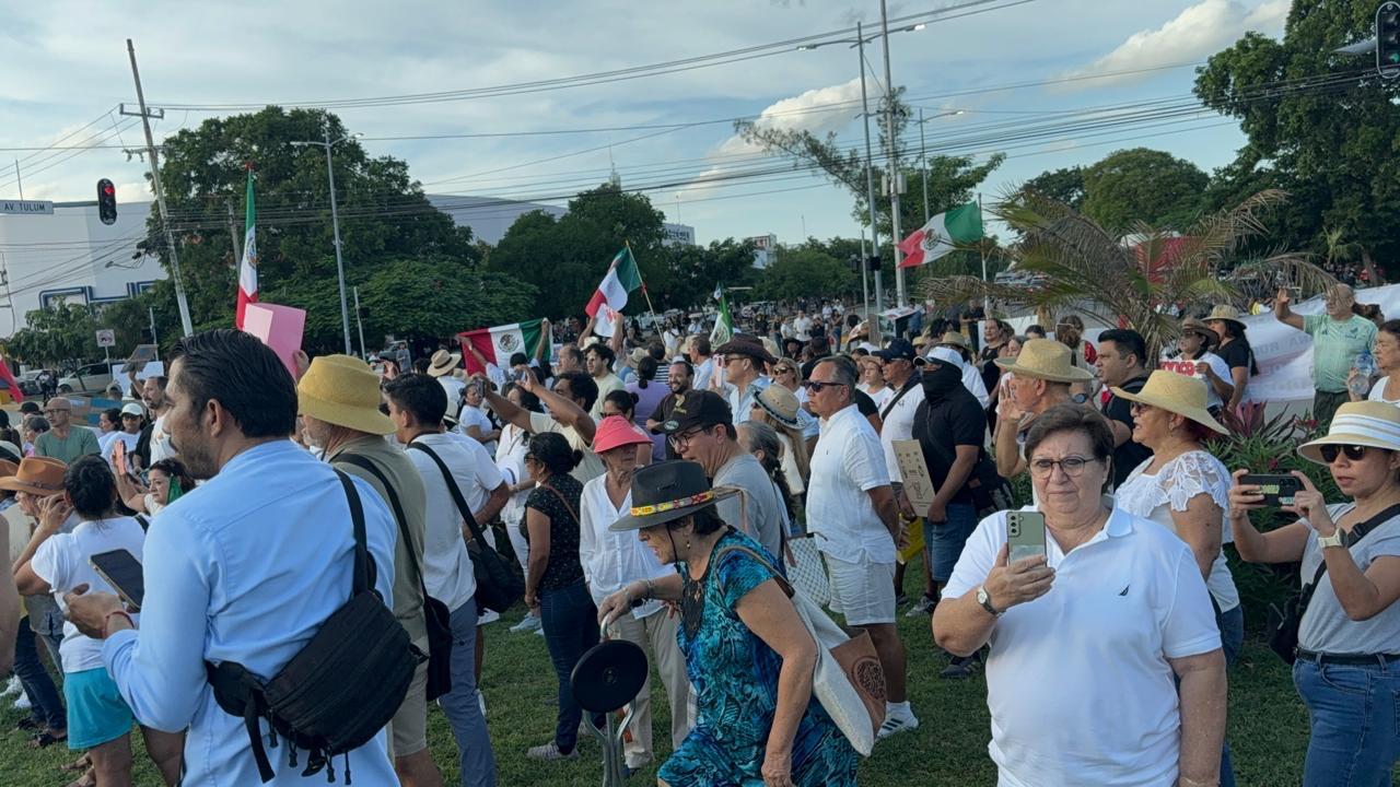 La manifestación se convocó tras el asesinato del alcalde de Uruapan, Carlos Manzo y otro grupo avanzó por la avenida Cobá hasta llegar minutos después de las 4.30 pm a la Glorieta del Ceviche y de ahí por la avenida Tulum hacia la Plaza Reforma en el Palacio Municipal.