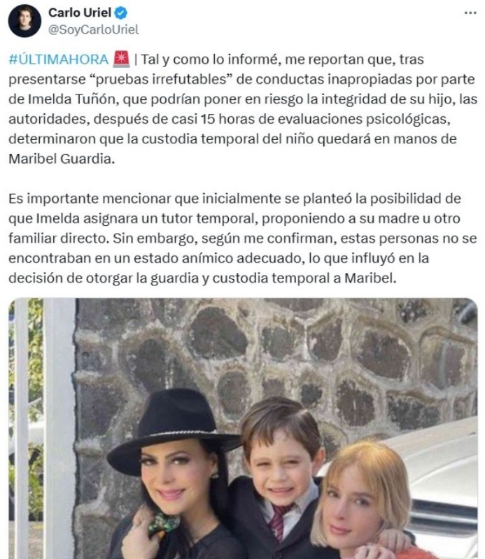 Ciudad de México (Marcrix Noticias).- Maribel Guardia ha obtenido la custodia temporal de su nieto, José Julián, después de presentar una denuncia contra su nuera, Imelda Garza Tuñón, por el delito de abandono de menores.