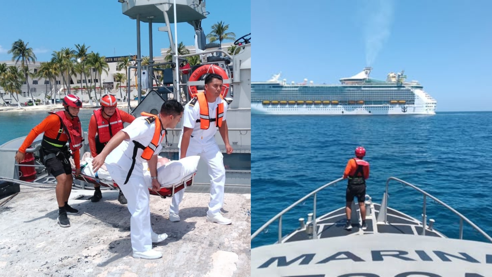 Al arribar al punto donde se encontraba el crucero, los elementos navales realizaron la valoración médica correspondiente y procedieron con la evacuación del paciente, quien fue trasladado a bordo de una embarcación de rescate tipo Defender hasta Puerto Juárez, en Quintana Roo.