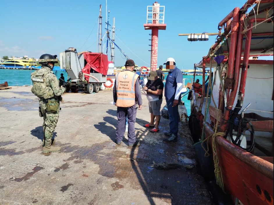 Cancún (Marcrix Noticias).- En un operativo realizado en el muelle de pescadores de Puerto Juárez, personal de la Quinta Región Naval, en colaboración con inspectores de la Comisión Nacional de Acuacultura y Pesca (Conapesca), sorprendieron a pescadores que realizaban actividades sin contar con los permisos correspondientes.