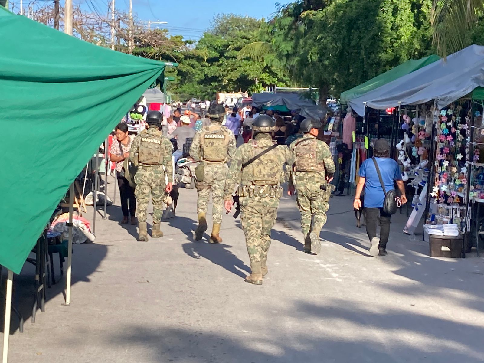 En un recorrido que se realizó por el citado tianguis, que inicia en la esquina de la avenida Chac Mool, en el estacionamiento de la tienda Chedraui de Puerto Juárez y que llega hasta la avenida Kabah, se observó a los Marinos realizando recorridos en el Tianguis.