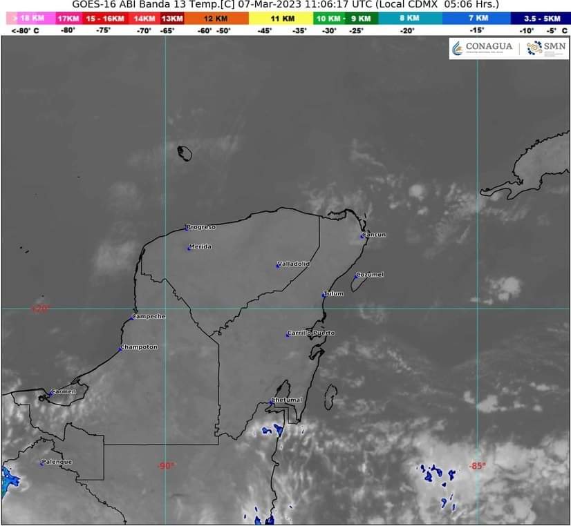 1.- Continúa la afluencia de aire marítimo principalmente del Mar Caribe hacia la región peninsular, mantendrá temperaturas templadas a cálidas por la noche y madrugada y muy calurosas durante el día, parcialmente nublado con incremento de nublados durante el transcurso del día, lluvias o lloviznas escasas o aisladas sobre la mayor parte del Estado de Quintana Roo durante el transcurso del día y noche.