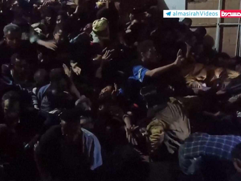 Un video emitido por la televisión hutí Al Masirah mostraba una multitud de personas, apretadas unas con otras, con la gente tratando de trepar por encima del resto para salir de la aglomeración.