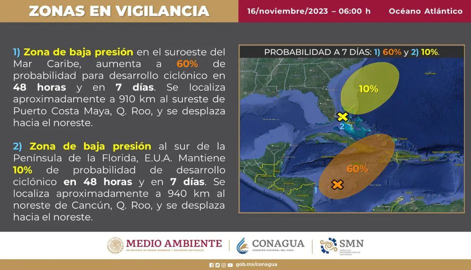 Por otro lado, la zona de baja presión al suroeste del Mar Caribe, aumenta a 60% de probabilidad para desarrollo ciclónico en 48 horas y en 7 días.