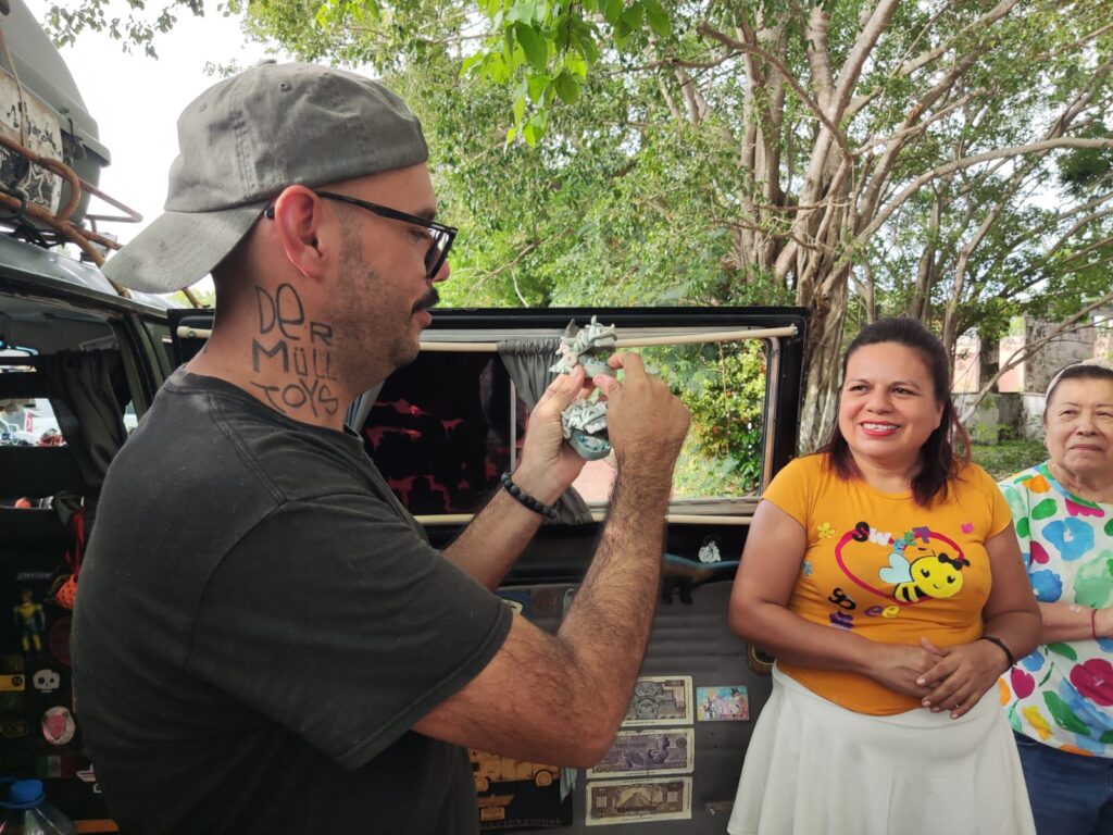 En el Centro Cultural de Calderitas muy cerca de Chetumal, Der Müll Toys, comparte su arte con las familias que se acercan para conocer su estilo de vida.