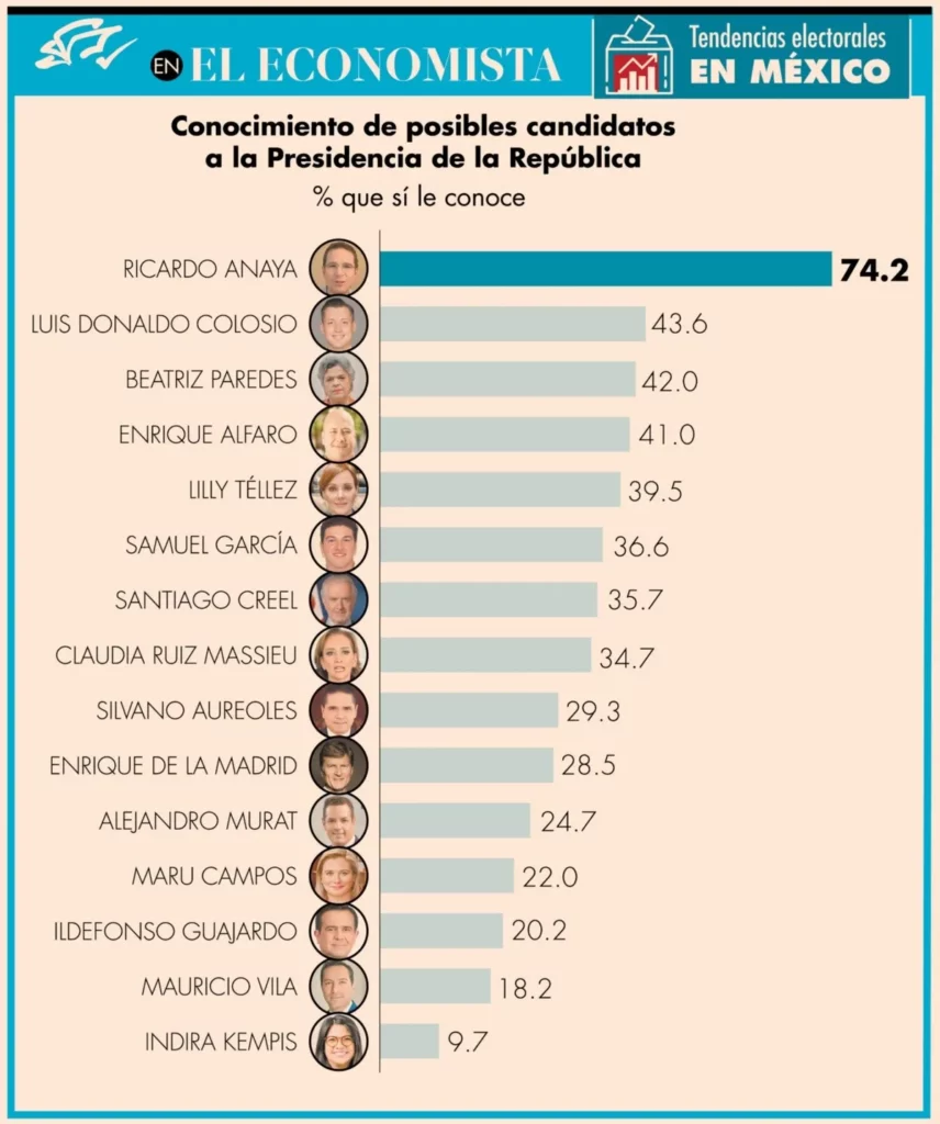 El panista Ricardo Anaya es de entre 15 posibles candidatos de oposición a la Presidencia de la República en 2024 a quien más conocen los mexicanos (74.2%); el segundo lugar lo ocupa Luis Donaldo Colosio (43.6%), de MC, y el tercero la priista Beatriz Paredes (42%).