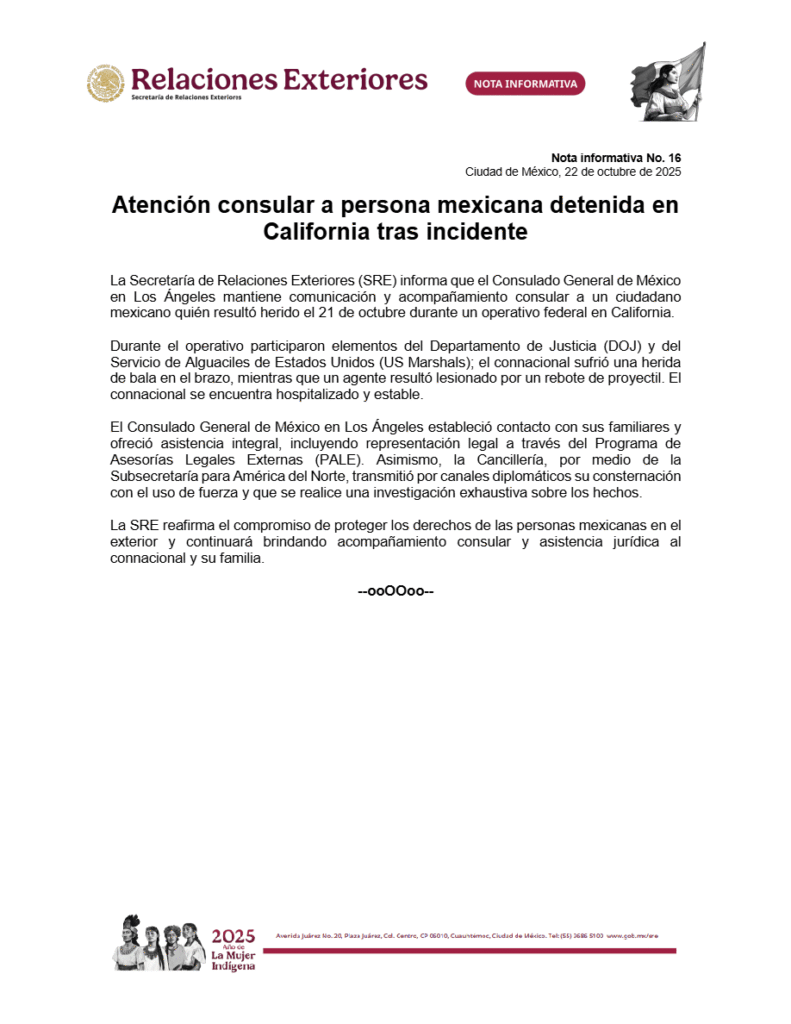 NOTA INFORMATIVA. “Atención consular a persona mexicana detenida en California tras incidente”.https://t.co/q02P1a4Svf pic.twitter.com/79xe0Y8IMO