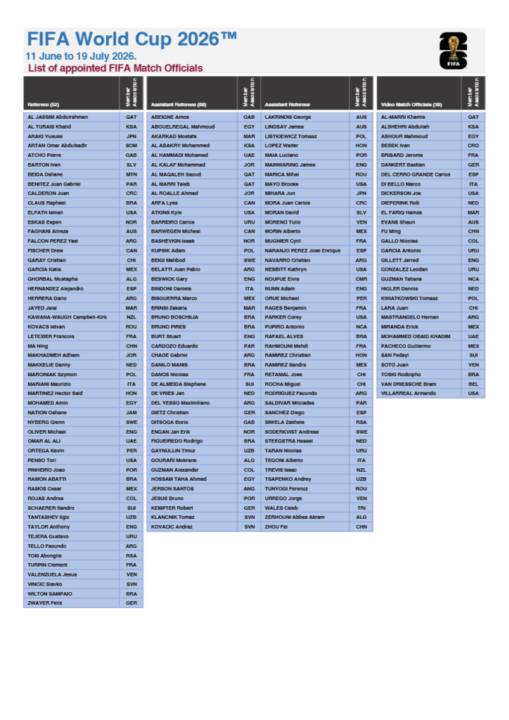 En total, el organismo seleccionó a 52 árbitros centrales, 88 asistentes y 30 árbitros de video, provenientes de las seis confederaciones internacionales y de 50 federaciones, conformando lo que la FIFA calificó como “el equipo arbitral más completo de la historia de la Copa Mundial”.