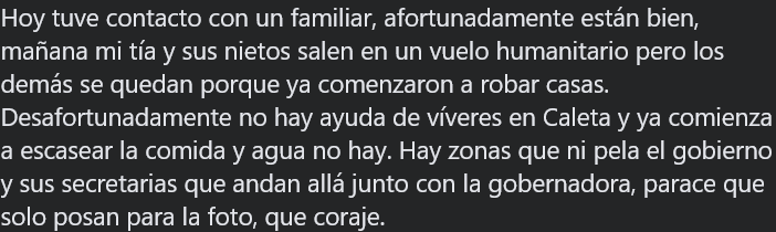 “Desafortunadamente no hay ayuda de víveres en Caleta y ya comienza a escasear la comida y agua no hay”.