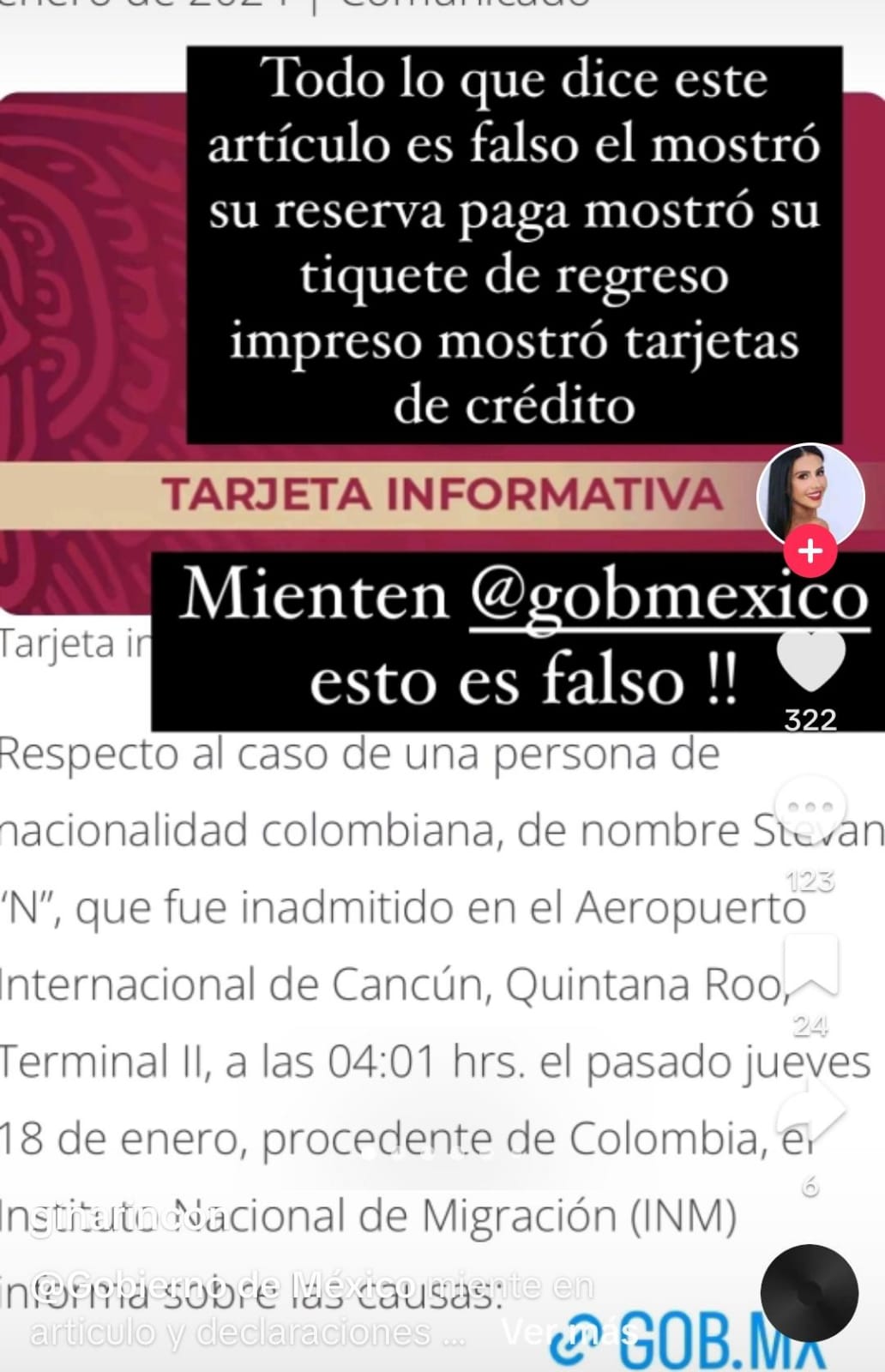 Luego de que el organismo dependiente de la Secretaría de Gobernación dio a conocer las razones por las cuales Stevan fue retenido en las oficinas de migración de la terminal aérea, la colombiana mostró documentos que desmentirían los argumentos de la autoridad.