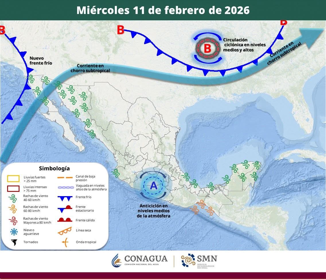 Asimismo, el ingreso de humedad proveniente del océano Pacífico, el Golfo de México y el Mar Caribe generará lluvias aisladas en entidades como Tamaulipas, Veracruz, Oaxaca, Guerrero, Chiapas y Quintana Roo.