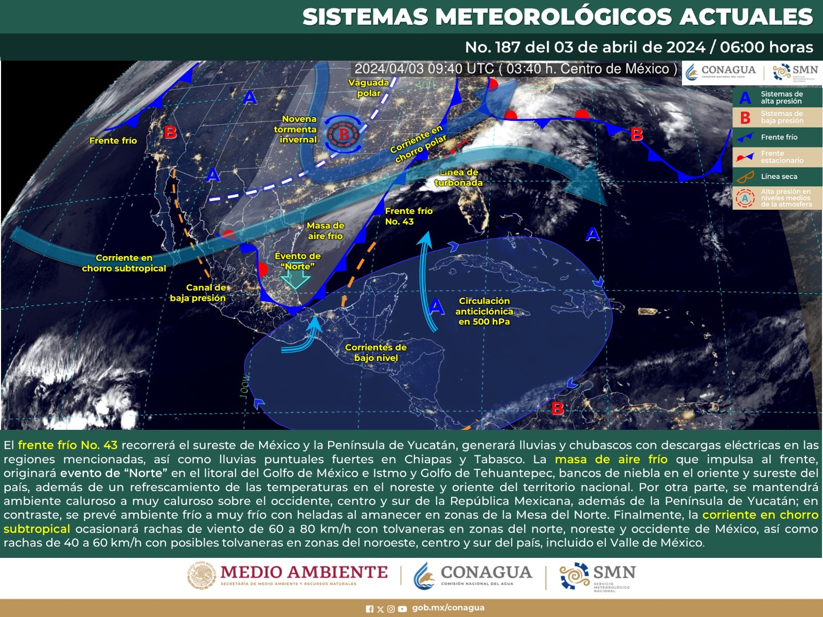 La masa de aire frío que impulsa al frente, originará evento de “Norte” en el litoral del Golfo de México e Istmo y Golfo de Tehuantepec, bancos de niebla en el oriente y sureste del país, además de un refrescamiento de las temperaturas en el noreste y oriente del territorio nacional.