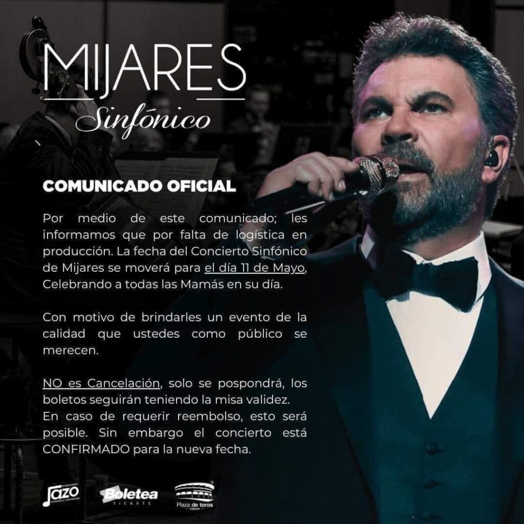Cancún (Marcrix Noticias).- El concierto que el cantante Mijares daría para sus fans en Cancún este próximo 7 de diciembre, en la Plaza de Toros, fue postergado hasta el próximo 11 de mayo de 2024.