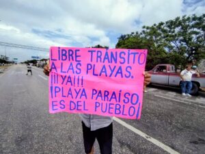 El bloqueo fue realizado por manifestantes que exigen el cese al cobro de acceso a las playas y al Parque del Jaguar, medida implementada por la empresa militar GAFSACOMM, que desde septiembre pasado administra el parque.
