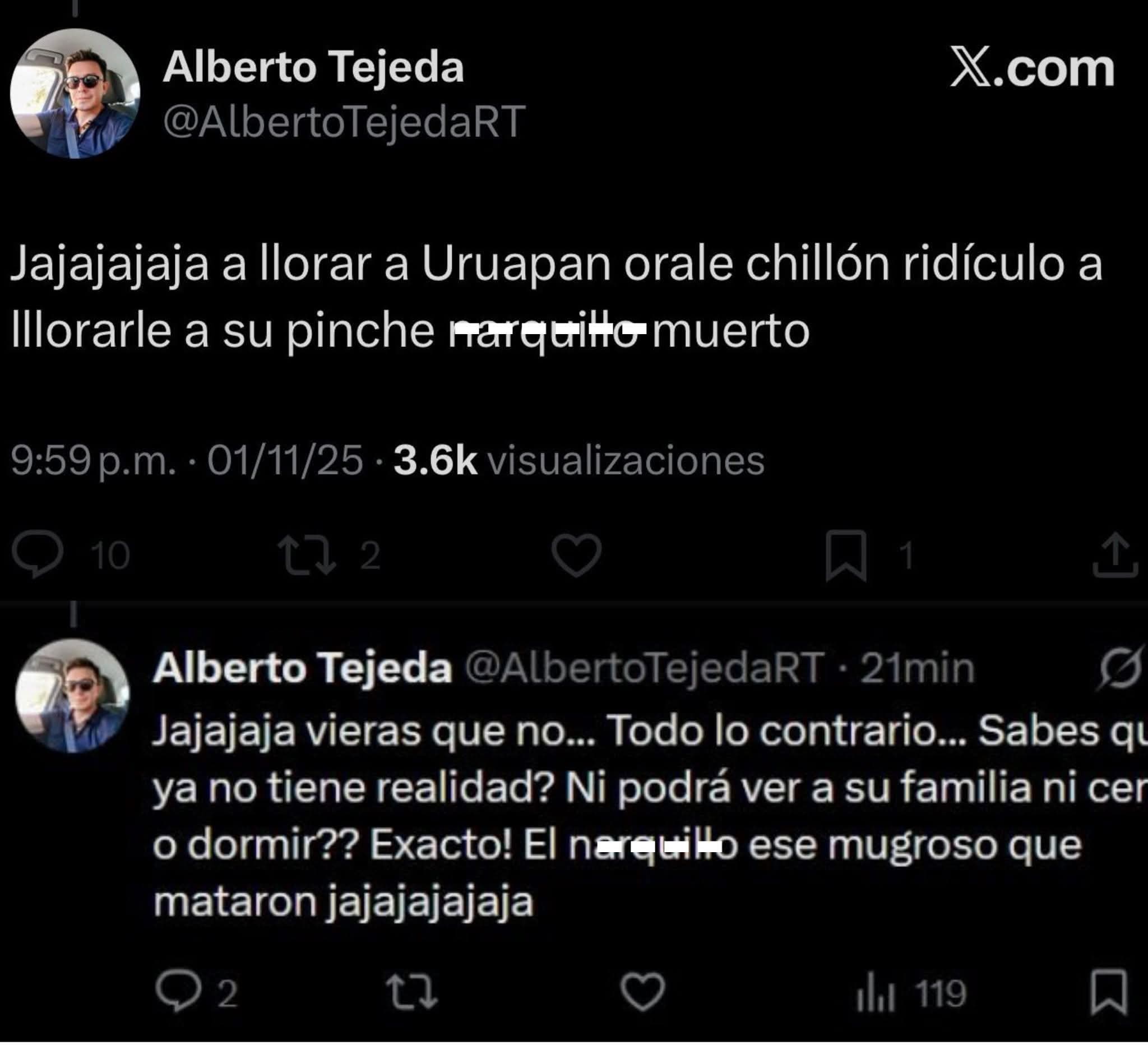 El morenista Alberto Tejeda llamó narquillo al alcalde de Uruapan al momento de burlarse de su muerte.