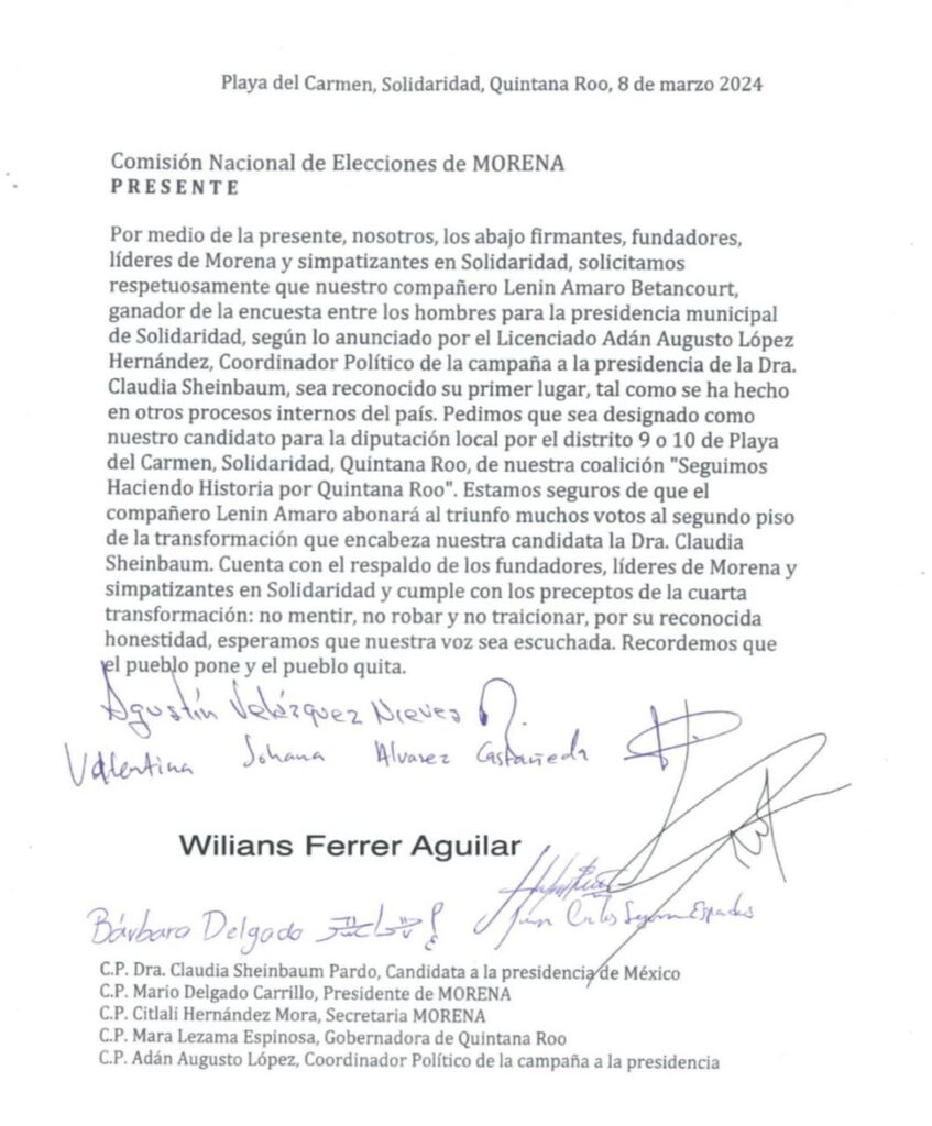 Mediante una carta dirigida a los líderes de Morena, los fundadores en Playa del Carmen, militantes, simpatizantes, precandidatas y precandidatos a la presidencia municipal de Solidaridad, solicitan que el abanderado a la diputación por el distrito nueve por la coalición “Juntos Sigamos Haciendo Historia” sea Lenin Amaro Betancourt.
