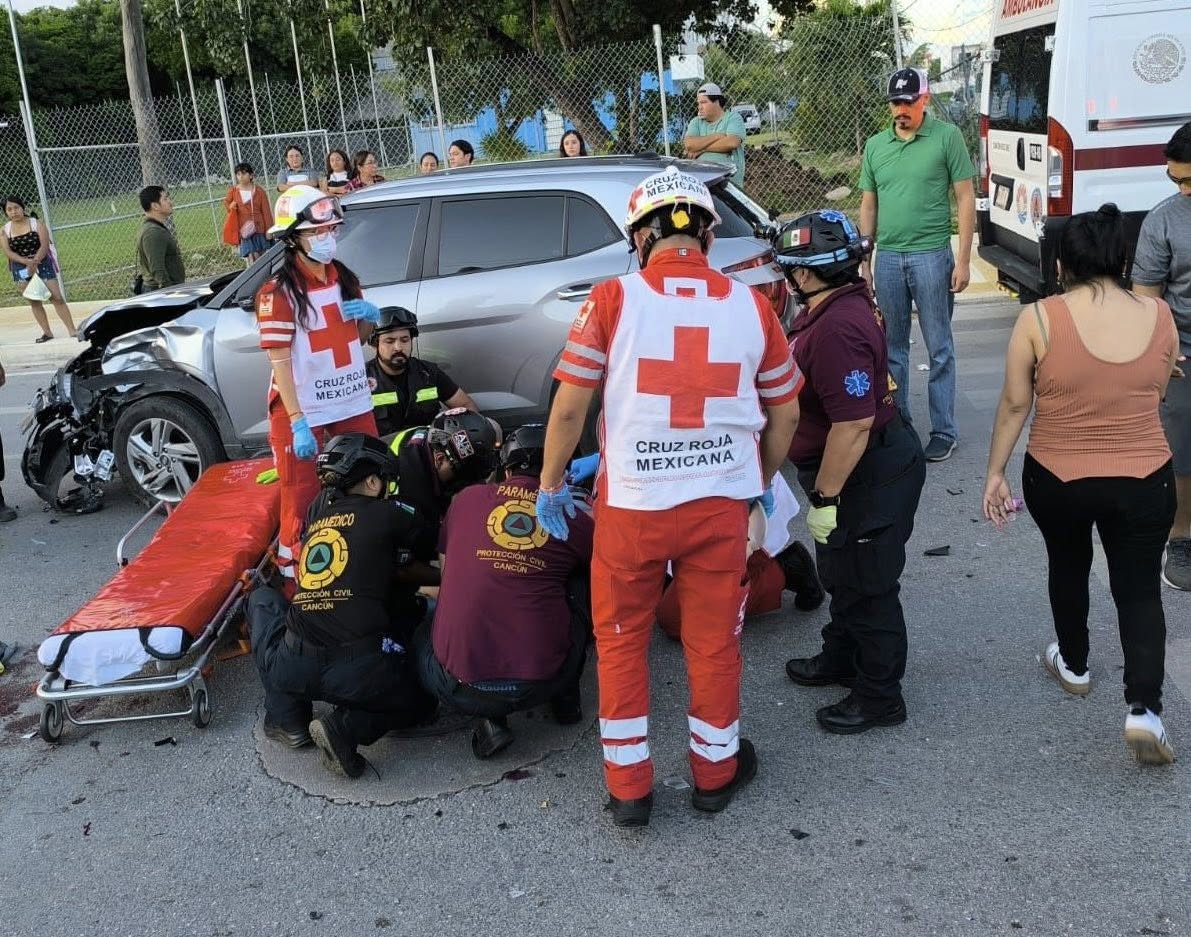 Cancún (Marcrix Noticias).– Un accidente de tránsito se registró este lunes, en el cruce de las Avenidas Politécnico con la México 510, donde un motociclista chocó contra una camioneta.