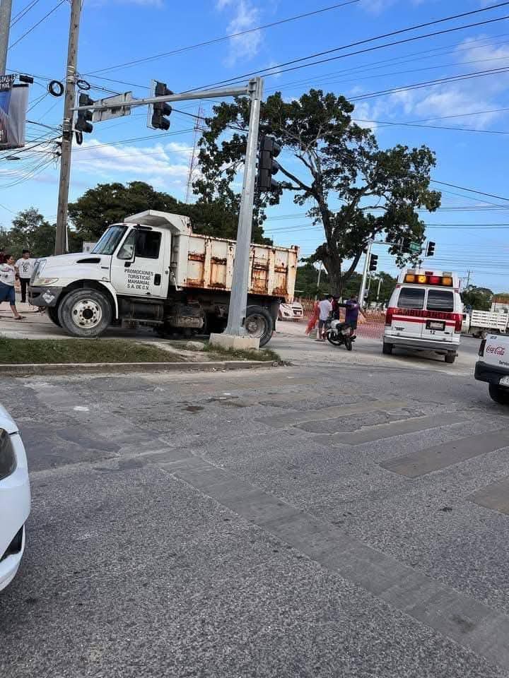 En este accidente en Chetumal, el motociclista aparentemente cruzó en luz verde del semáforo ubicado en el cruce de la avenida Insurgentes con Aaron Merino, fue embestido por el volquete y quedó abajo y sobrevive.