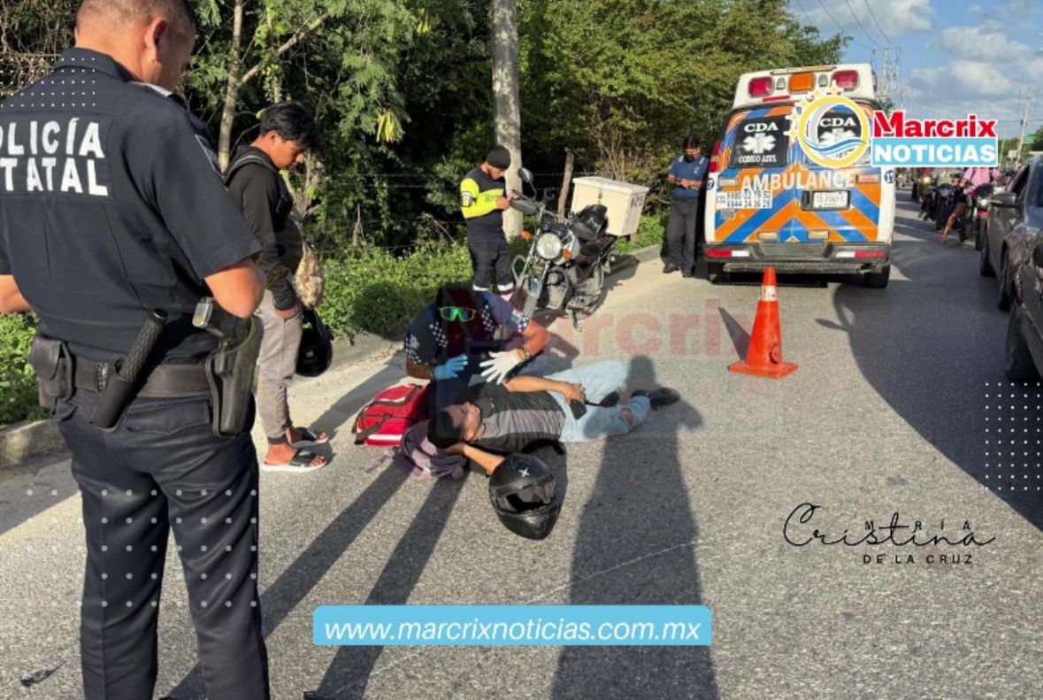 Cancún (Marcrix Noticias)-El incidente ocurrió el 4 de enero de 2025 en la intersección del Arco Vial y la avenida Rancho Viejo. Según el reporte preliminar, el conductor de un Chevrolet Aveo blanco, al salir del estacionamiento del supermercado Chedraui, no respetó la preferencia vial e invadió el carril del motociclista, provocándole un corte de circulación.
