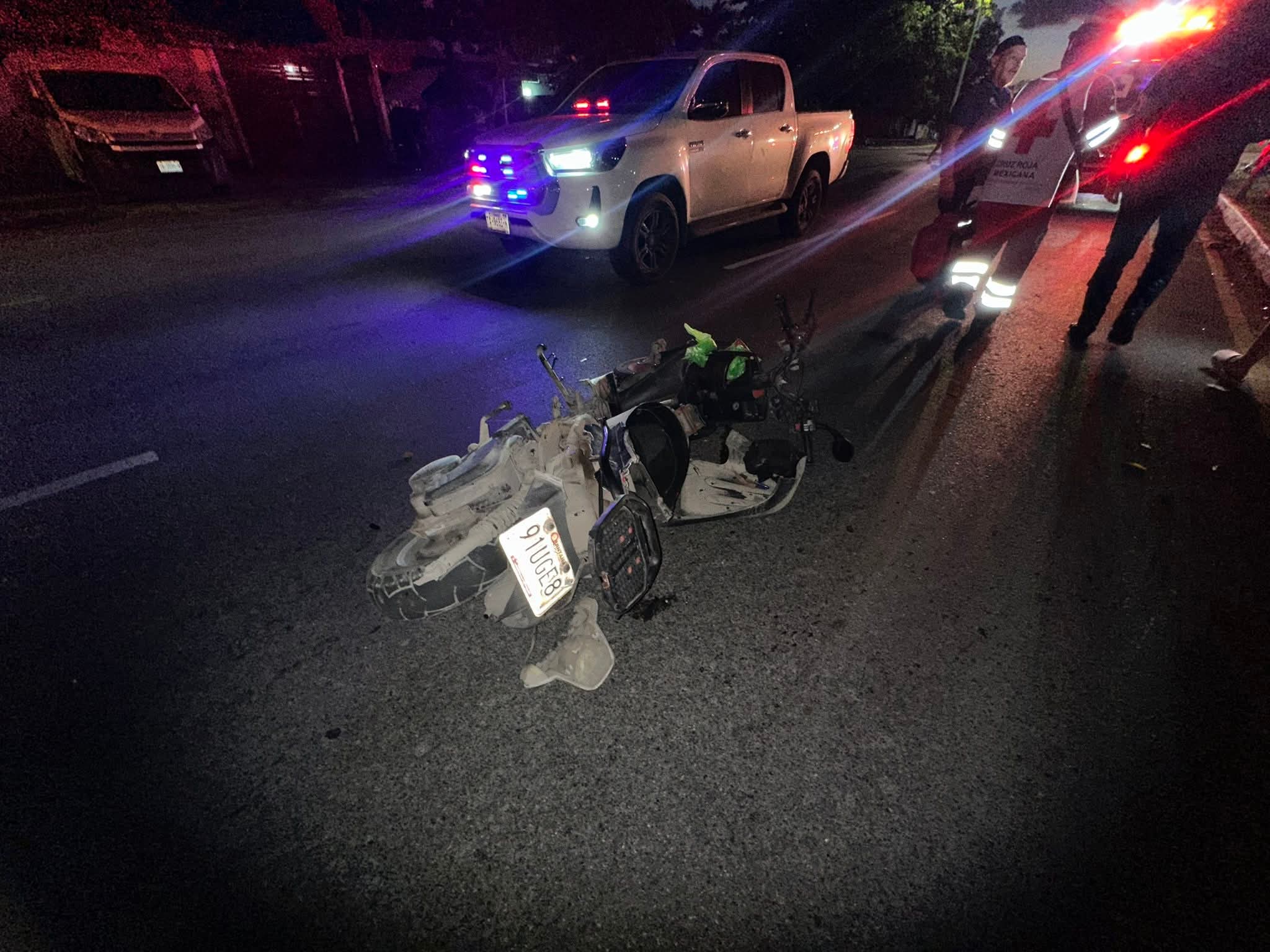 Playa del Carmen(Marcrix Noticias).- Un aparatoso accidente entre dos motocicletas se registró la noche del domingo en Playa del Carmen, frente a las instalaciones de la CFE y en el cruce de la avenida Tumben Kin con Arco Vial, provocando lesiones severas y daños de consideración.