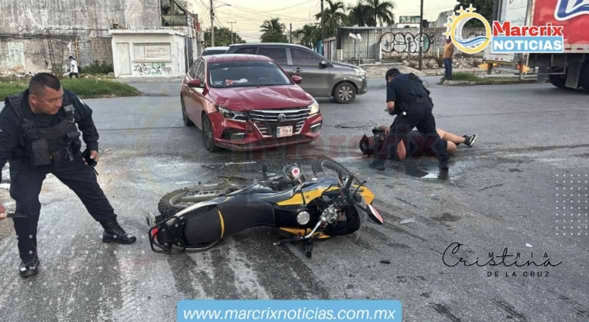 Cancún (Marcrix Noticias)-Un motociclista resultó con lesiones de consideración la mañana de este miércoles, luego de impactarse contra un vehículo que le cerró el paso en la Supermanzana 220 de Cancún.