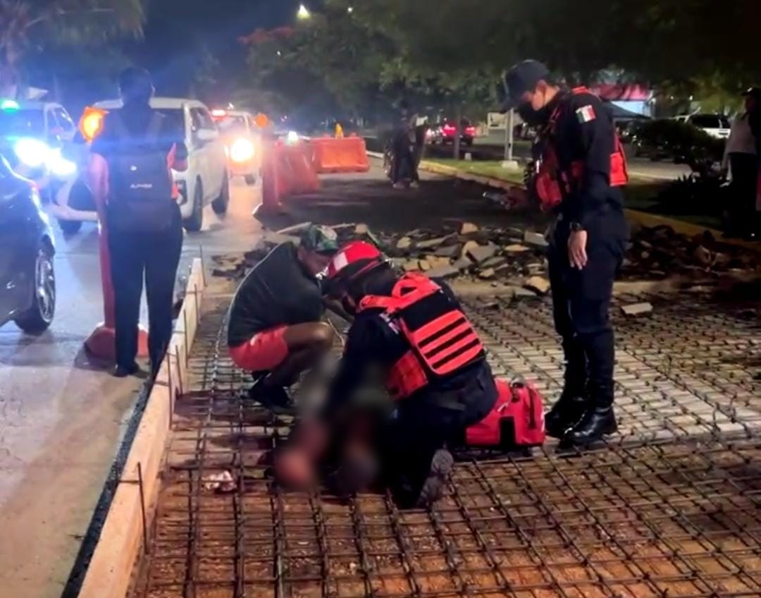 Playa del Carmen(Marcrix Noticias).- Una aparatosa escena se registró la noche del viernes en la avenida Chemuyil de Playa del Carmen, donde un motociclista terminó herido de gravedad al caer directamente sobre una cama de varillas de acero expuesta en una obra en construcción.