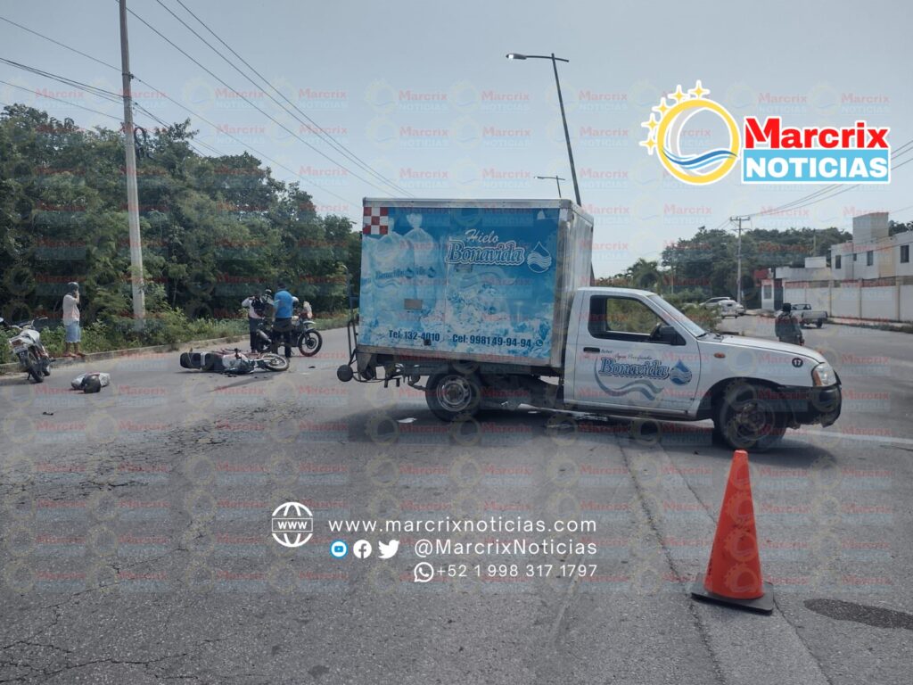 Todo indica que una camioneta Estaquitas de la empresa Bonavida iba sobre la avenida Chac Mool, pero iba a doblar hacia la izquierda, en Galaxias del Sol, pero la motocicleta se estrelló contra ella.