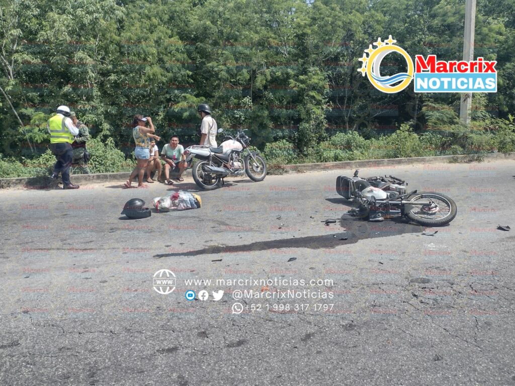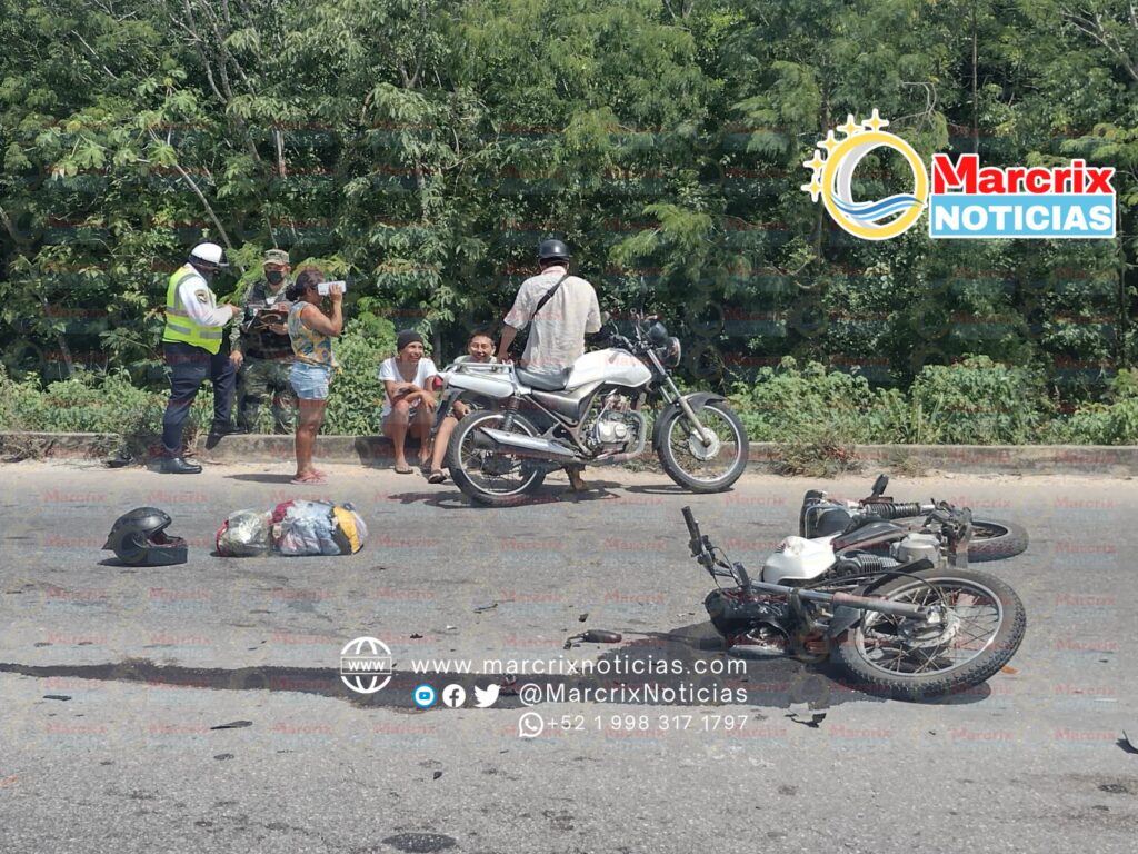 Cancún (Marcrix Noticias).- Un par de motociclistas quedaron heridos durante esta mañana, luego de estrellarse contra una camioneta Estaquitas en la avenida Chac Mool de Cancún.