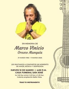 “Hoy nos toca despedir a un gran hombre, pero su música seguirá resonando en nuestros corazones. Acompañemos a Marco Vinicio Orozco Munguía en su último concierto de vida”, señala la invitación difundida entre sus allegados.