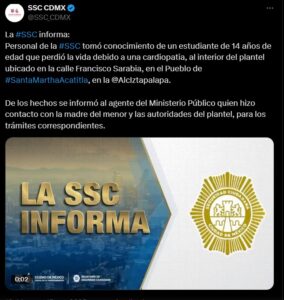 La Autoridad Educativa Federal en la Ciudad de México (AEFCM) detalló en un comunicado que el alumno sufrió un desvanecimiento repentino durante la jornada escolar, y que el personal del plantel actuó de inmediato al solicitar atención médica y contactar a las autoridades.