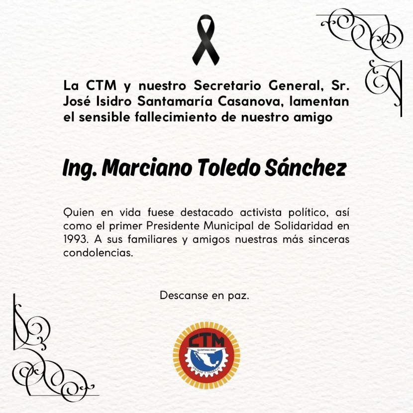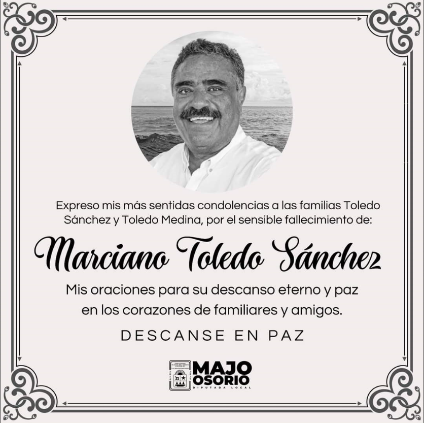 Playa del Carmen(Marcrix Noticias).- El destacado luchador social, político, promotor de la creación del municipio de Solidaridad y empresario, Marciano Toledo Sánchez, conocido como “Don Chano”, falleció la mañana de hoy por causas naturales a la edad de 65 años.