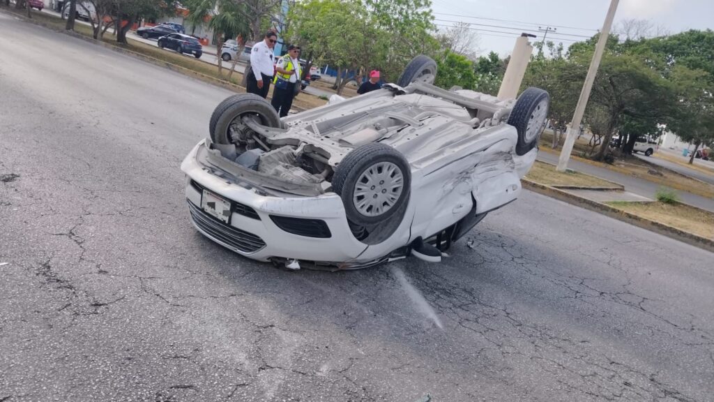 En otro hecho, en el cruce de las avenidas Andrés Quintana Roo con avenida de Sol, en la Supermanzana 44 de Cancún, un vehículo quedó volcado.