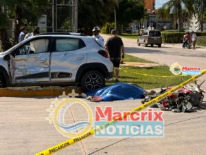 En ese momento, el conductor de una motocicleta Italika de 125 centímetros cúbicos, color rojo con negro, que se desplazaba sobre la avenida Huayacán con dirección a la carretera federal 180, se impactó contra el costado izquierdo del automóvil, sin que pudiera evitar la colisión.
