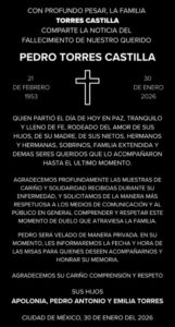 “Con profundo pesar, la familia Torres Castilla comparte la noticia del fallecimiento de nuestro querido Pedro Torres Castilla, quien partió el día de hoy en paz, tranquilo y lleno de fe”, se lee en el mensaje que generó múltiples reacciones y muestras de condolencias por parte de figuras del medio artístico.